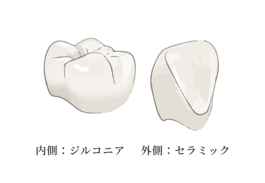 自然な見た目のセラミックの内側に、ジルコニアを貼りつけた被せ物(クラウン)です。2つの素材を合わせるので、自然な見た目を保ちつつ、強度と耐久性がアップして硬いものもしっかりと噛めます。