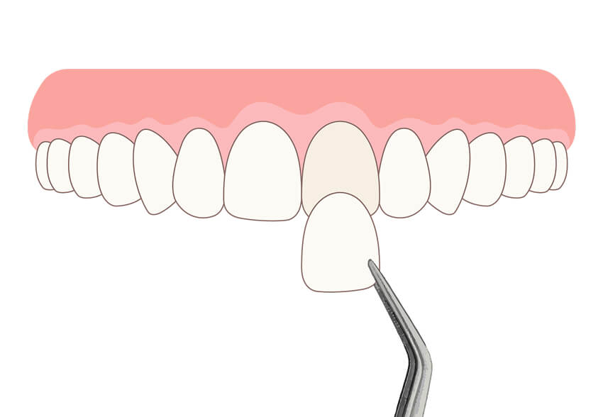 セラミックを薄い板状にして、歯の表面に接着剤で貼り付けます。ホワイトニングをしても白くならない歯や、神経を抜いて黒ずんでしまった歯でも、白い自然な見た目を取り戻せます。歯の一部が欠けてしまった際の修復も可能です。