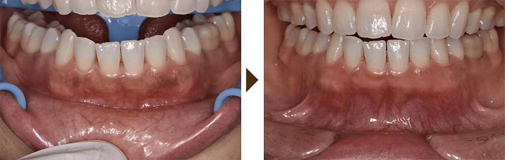 ピーリング(peeling)は果物などの皮をむくことを意味しており、歯ぐきのピーリングを行うことにより、黒ずんだ歯茎がまるで一皮むけたように、きれいなピンク色に生まれ変わります。