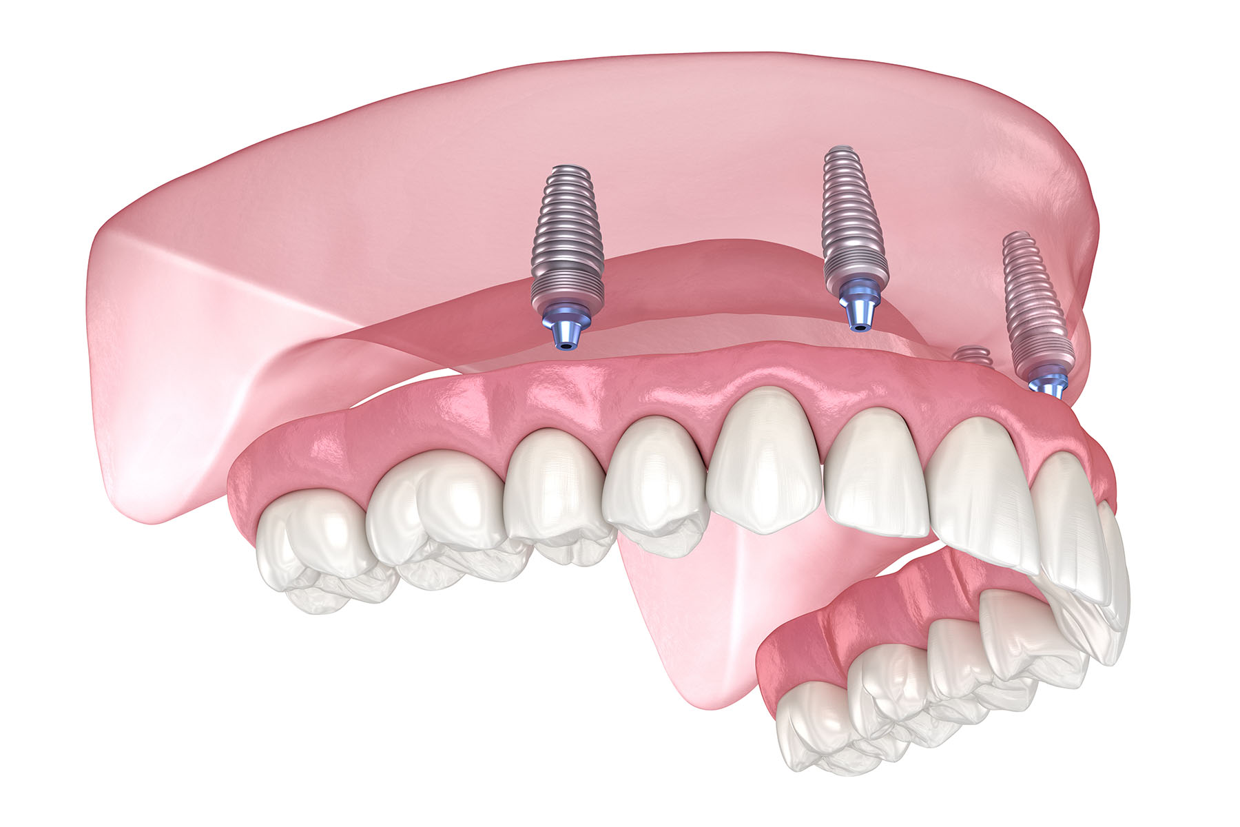 オールオン4は、片顎(上顎または下顎)に対して最少4本のインプラントのみで、前歯から奥歯まで一体となった人工歯をしっかりと固定できる治療システムです(顎の骨の状態によっては6本で対応する場合もあります/All-on-6・オールオンシックス)。