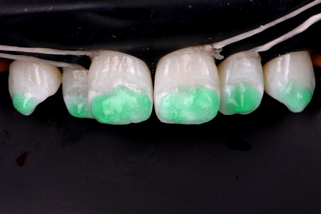 ラバーダム(ゴムのシート)を装着のうえ治療箇所以外を保護し、前処理としてアイコン・エッチの塗布を行います。